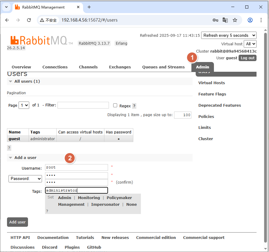 默认登录用户guest 密码guest,按照下面步骤,添加新的root用户,密码root。