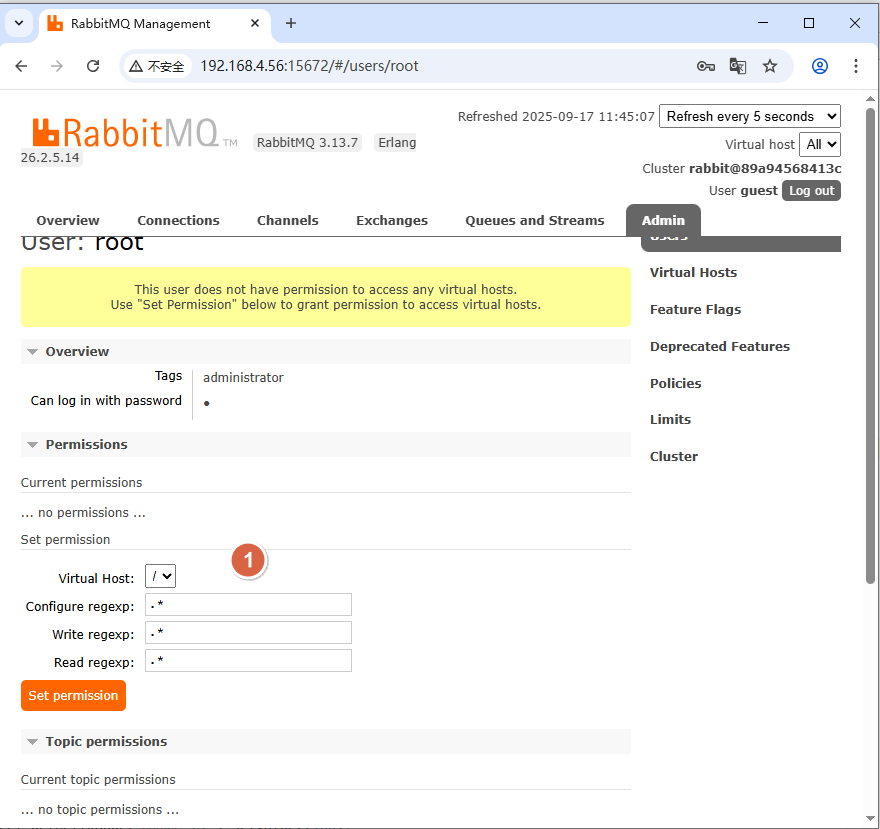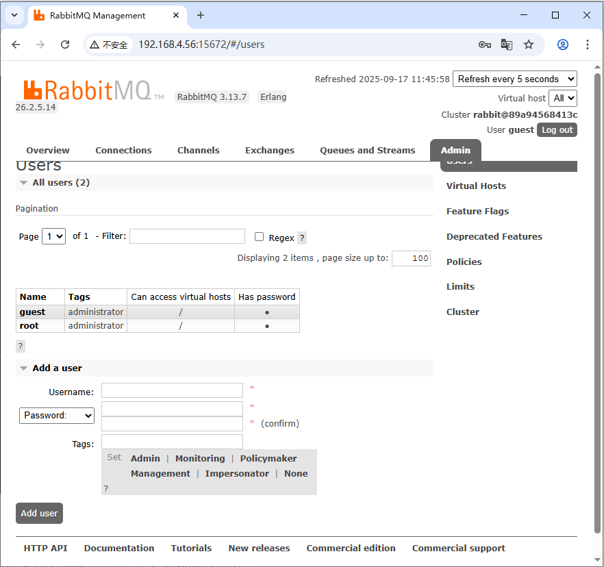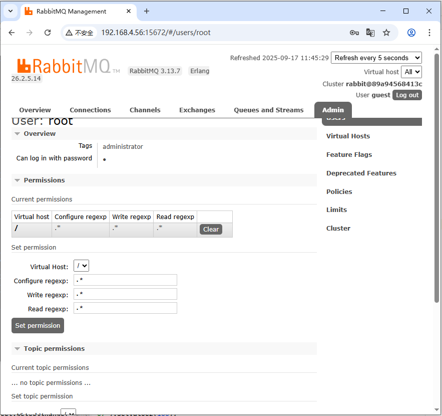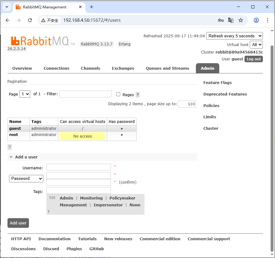 另外,也可以通过浏览器访问IP:15672,如http://192.168.4.56:15672/ 添加用户并设置管理员权限。