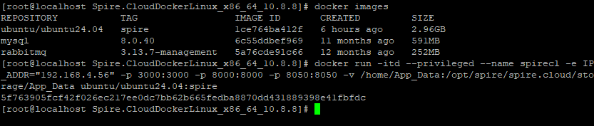 docker run -itd --privileged --name spirecl -e IP_ADDR="192.168.4.56" -p 3000:3000 -p 8000:8000 -p 8050:8050 -v /home/App_Data:/opt/spire/spire.cloud/storage/App_Data ubuntu/ubuntu24.04:spire
