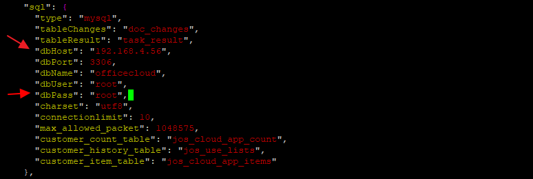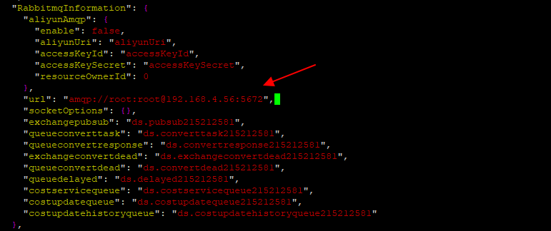 (6)更改配置文件/opt/spire/spire.cloud/service/Common/config/default.json中的mysql的dbPass 、dbHost和rabbitmq的url地址(可以安装vim进行编辑 apt install vim), 箭头所指位置改为宿主机的ip地址