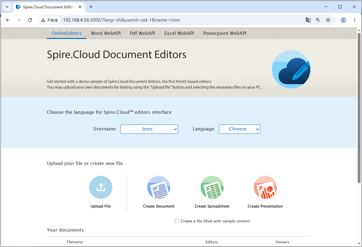 Spire.Cloud 产品主要涉及的端口服务:8000 在线编辑服务(如需嵌入你的文档系统请参考前端快速接入8000编辑服务示例);3000 示例文件系统服务;8050 WebAPI接口服务。我们可以使用3000示例服务进行体验测试 ,在浏览器地址栏输入“[服务器 ip]:3000”(针对本次部署: 192.168.4.56:3000),出现以下界面: